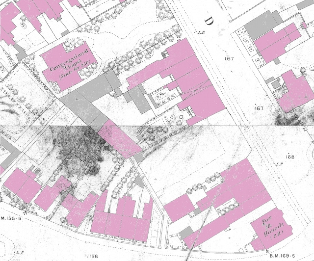 - I make the distance between the south boundary of number 1 and the south boundary of number 13 to be approximately 159 feet 1 inch on the 1868 Town Plans (97mm, i.e. 48.5 metres at the scale of 1:500) and 160 feet 9 inches on the August 2001 Goad plan (49mm, i.e. 49 metres at the scale of 1:1000). The small discrepancy between the 1868 Town Plans and the August 2001 Goad plan here is probably because this area of London Road appears on two separate sheets in the Town Plans, making it hard to measure properly. The discrepancy between these distances and the 178 feet 6 inches stated for James Turner’s 1835 purchase is harder to explain — where are the missing 18 feet? My feeling is that they must lie under the side road (now Derby Road); there’s a very plausible-looking bend at this end of Derby Road, starting further up than would correspond to the small portion nipped off the corner of James Turner’s plot on the 1835 map. Henry Braun concurs: “Even without going out with a tape measure it's clear that the square Fox and Hounds building wasn't built right up to the SW corner of the original plot 19: there's only a depth of about 14 feet there from the line of the road, while the F&H is at least 30 feet deep and set back another 6 or 8 feet from the original road edge” (online discussion, July 2013). It thus seems that the London Road end of Derby Road was moved slightly to the north at some point, though I’ve not found any documentary evidence of this. The best theory I’ve heard as to why this might have happened is one proposed by bob walker, specifically that the road was moved in order to make room for the 1847 extension of the railway down to Epsom.