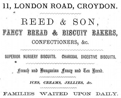 The goods on offer at Reed’s are described in street directories of the time[1]: “the Celebrated ALICE and CHARCOAL BISCUITS[2]”, “wedding and school cakes”, “ices, jellies, British wines”, “superior nursery biscuits”, and “French and Hungarian Fancy and Tea Bread”.[3]