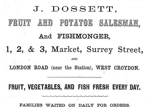 Hence the earliest commercial occupant I’m sure of is J Dossett, a greengrocer and fishmonger who first appears in Ward’s 1874 directory sandwiched between two ironmongers: Thomas G Newton to the left and Samuel Piggott to the right.[5] Mr Dossett also had premises on Surrey Street, and advertised “fruit, vegetables, and fish fresh every day”. Around 1878 he handed his business over to a William Dossett — perhaps his son or other relative. However, within a couple of years William Dossett pared back his business to the Surrey Street premises alone, with the London Road premises passing to Henry G Dean, fruiterer and greengrocer.[6]