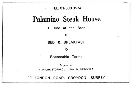 - Palamino Steak House is listed at 22 London Road in the July 1971 North East Surrey and the February 1972 Croydon phone books. Other information comes from the 1971 advertisement included in the article.