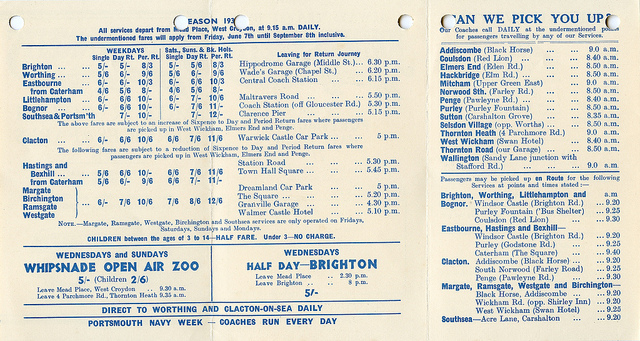These coaches were used for all kinds of excursions, including express services to the coast in summer, departing from Mead Place at 9:15am for destinations such as Bognor Regis, Brighton, Clacton, Margate, Southsea, and more.[12] According to an advertisement in the Croydon Official Guide 1963, John Bennett’s coach tours for that year offered “coastal services & excursions” as well as “a wide variety of Half Day, Day and Long Day Tours” with destinations including Cheddar Gorge, Coventry Cathedral, the Norfolk Broads, and Wookey Hole.