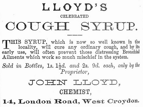 - John Lloyd is listed in street directories from Wilkins’ 1872–3 to Ward’s 1885. Information on products sold taken from the advertisement reproduced in the present article and another advertisement on page 11 of the April 1880 Croydon Review.