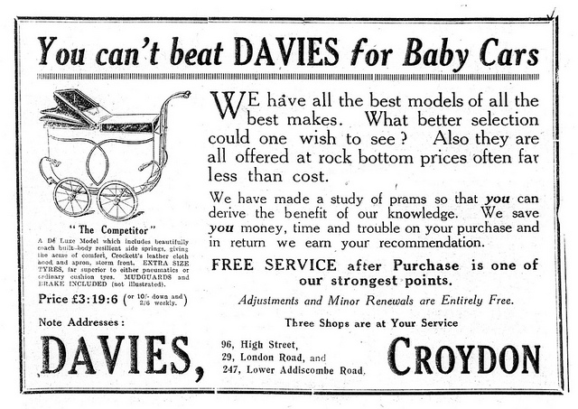 In 1922, D L Davies opened a new shop at 29 London Road specialising in baby carriages[4] — or prams, as we’d call them today. By 1926 this had been joined by branches at 96 High Street and 247 Lower Addiscombe Road.[5] A wide range of prices was on offer, with a 1928 advertisement stating that “Whether you want a Pram at 45/- or £4 15 0 or £15, it pays to go to Davies”.[6] There was the option of hire purchase, too; for example, an advertisement in the Croydon Times of 16 June 1928 includes a drawing and description of a pram called “The Competitor” with a “beautifully coach built body” and “resilient side springs”, priced at £3 19 6 or 10/- down and 2/6 weekly.