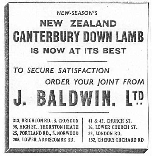 J Baldwin Ltd traded at 33 London Road until 1960 or 1961, marking nearly 45 years under the same owner and over 70 years of butchery. However, by the end of 1961 the firm had departed from London Road, though it continued to trade elsewhere in and outside Croydon.[10]