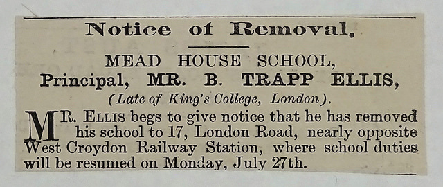 - Date of school opening taken from a notice in the 11 July 1868 Croydon Chronicle (reproduced here), found as a cutting in the “Mead House School” private schools folder at the Museum of Croydon. Other information taken from Warren’s 1869, Wilkins’ 1872–3 and 1876–7, Worth’s 1878, Atwood’s 1878, Tomkies’ 1879–80, and Purnell’s 1882 directories; and Ward’s directories from 1874 to 1888 inclusive. Regarding Charles Mancer/Manser, Wilkins’ 1872–3 has him as C Mancer, while Ward’s 1874 has Charles Manser.