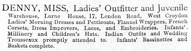 The building next moved to educational purposes, as the home of Benjamin Trapp Ellis’s “School for Young Gentlemen”, in July 1868. However, just a couple of years later, this school gave way to a succession of drapers: Charles Manser (or Mancer), draper, milliner, and costume maker (c. 1872–4); Miss Denny, ladies’ and children’s outfitter (c. 1876–7); M Nottidge, ladies’ outfitter (c. 1878); Miss Gye, ladies’ and children’s outfitter (c. 1878); J Woolnough, fancy draper and milliner (c. 1880–2); Woolfrey & Woodbridge, fancy drapers and milliners (c. 1884); and Henry R Caldecott, fancy draper and milliner (c. 1885–7).[5]