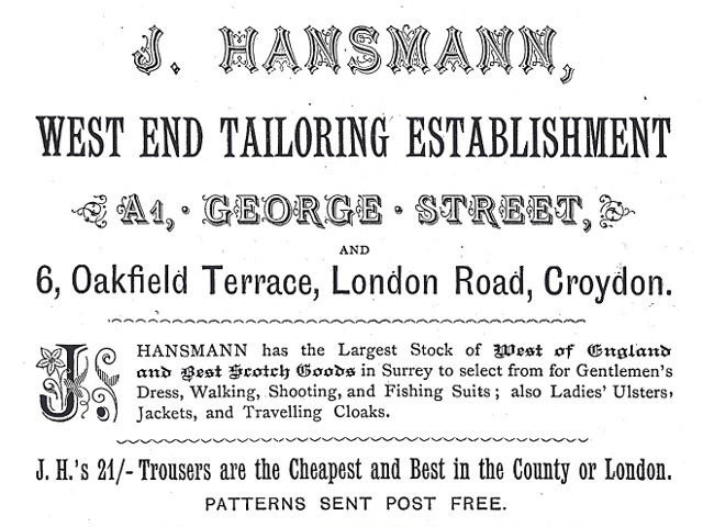 - Documentary evidence disagrees over the spelling of Joseph and Fanny’s surname, though I believe “Hansmann” is the most likely. In the 1881 census record, it’s quite clearly spelled as “Hausmann”, while in the 1891 census, the third letter could be either “n” or “u”. Note however that these (handwritten) census records were copied out centrally from forms filled in by householders, so the clear spelling in the 1881 census could have been due to a misreading of Joseph’s less-clear handwriting. Henry Braun points out that “if Joseph had German handwriting the lower-case N and U are distinguished only by an inflection above the letter, so it’s a very obvious source of confusion.” (online discussion, May 2014). A London Gazette announcement from January 1891 spells the name with a “u”. However, the “n” spelling appears in Ward’s directories (both listings and adverts), Purnell’s 1882 directory, Kelly’s directories, and an advert in J Corbet Anderson’s A Descriptive and Historical Guide to Croydon, Surrey (published 1887). I think a single typo in the London Gazette combined with a single misunderstanding in the 1881 census is much more likely than repeated misspellings in multiple directories and in advertisements placed over a number of years by Joseph himself.