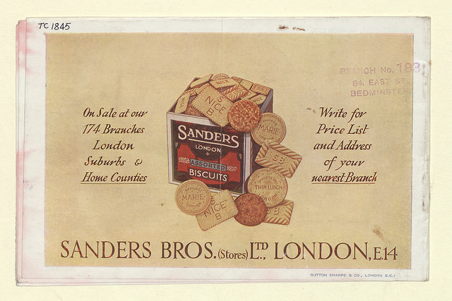 The foundation of Sanders Bros was laid in 1887, when Thomas Sanders took over a corn merchant’s shop on Globe Road in Bethnal Green. Thomas was in his mid-20s at the time, and had previously worked in his father’s beer shop around the corner on Green Street (now Roman Road).[12] In 1891 he opened a second branch on James Street, also in Bethnal Green. A couple of years later he was declared bankrupt, but this proved no obstacle to the continuation of the business, which was transferred to two of his brothers, William and Joseph — and the name “Sanders Bros” was born.[13] Further expansion followed, and by 1900 the firm had 22 branches and had diversified from the usual items sold by a corn merchant — flour, rice, pulses, dried fruit, hay for horses, and birdseed — to more general grocery items such as vinegar.[14]