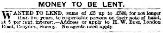 It’s also not clear that his money-lending activites were particularly legitimate. He, or at least someone using his name and address, placed several advertisements in a Yorkshire newspaper in 1873, offering 5-year unsecured loans at only 5% interest.[5] The distance of Yorkshire from Croydon, the overly-long term for an unsecured loan, and the suspiciously generous rate of interest all suggest some form of advance-fee fraud. Indeed, in December 1879, two men named John Airey and William Kelly were sentenced at the Old Bailey to nine months imprisonment each for conducting this type of fraud using Henry Buer’s name. Henry himself was not tried, possibly because he’d got out of the business by then.[6]