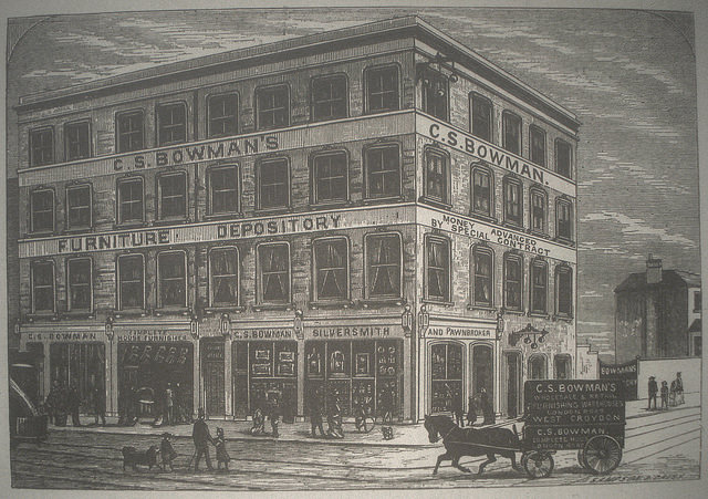 Initially operating only as a pawnbroker and jeweller, in 1880 Charles Bowman expanded his business to also encompass furniture.[12] By 1881 he was trading across four shopfronts, advertising himself as a “complete house furnisher, upholsterer, and cabinet manufacturer”, and claiming to have “the largest stock of carpets in Croydon, at the lowest possible prices.”[13]
