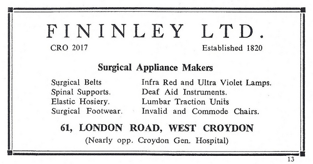 - Fininley Ltd, surgical appliance makers, appears in phone books from the October 1955 Outer London (Kent/Surrey) edition to the 1988 Croydon edition inclusive, Goad plans from August 1974 to April 1987 inclusive (I don’t currently have access to Goad plans earlier than 1974), Brian Gittings’ 1980 survey of central Croydon retail, and the London Shop Surveys of 1984–85, 1986–87, and 1988–89 (the latter source misspells it as “Finnley”).