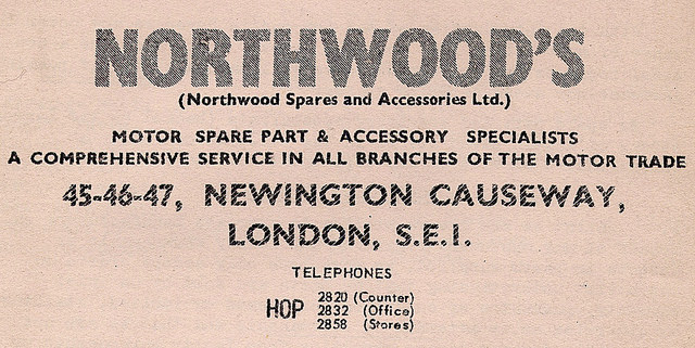 - The documentary evidence for this is somewhat contradictory, as listings in contemporary London phone books seem to jump around between different addresses. Northwood is listed at 45 Newington Causeway until October 1967, and at number 64 in April 1969. Causeway appears for the first time in May 1968, listed at number 45; in March 1970 it’s instead at number 34. However, Dave P states on the Austin Seven Friends forum that “Causeway Autos and Northwoods were situated on opposite sides of Newington Causeway and were owned by the Northwood family.” and confirms in another posting that “Nos.34/36 Newington Causeway was the Causeway Autos shop.” David Waller of the Austin Seven Owners Club (London) tells me that Causeway Autos in Newington was an existing shop that was taken over by Northwood’s, and that “I think they [Northwood’s] took on the stock from Causeway and when they ran out of A7 parts I and other owners then moved on to other dedicated A7 spares suppliers.” (via email, 29 December 2014)