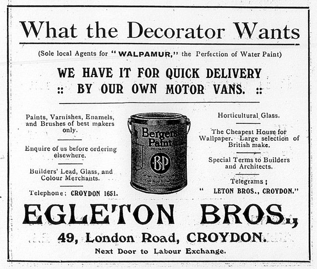 - Egleton Bros is listed in Ward’s directories from 1913 to 1939 inclusive (1939 was the final edition of these directories). It also appears in Croydon phone books up to and including 1959, but is absent from the 1960 and subsequent editions.