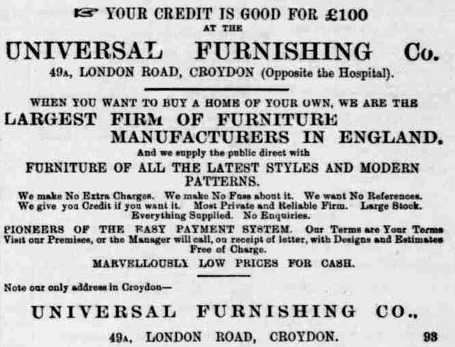- The Universal Furnishing Co is listed in Ward’s directories from 1899 to 1909 inclusive. An advertisement for the Angel Furnishing Stores, “6, Pentonville Road, Islington, N. (Next to Angel)”, on page 20 of the 14 January 1900 Lloyd’s Weekly Newspaper lists branches at 136 Deptford High Street, 223–225 Whitechapel Road, and (under the name Universal Furnishing Co), 49A London Road, Croydon. Given the name “Angel”, it does seem likely that the Islington store was the original one. (Advertisment viewed online at the British Newspaper Archive; requires subscription).