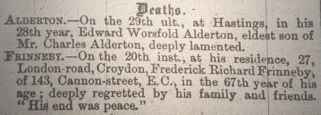 - Frederick’s death date and age are reported in a notice on page 5 of the 24 December 1870 Croydon Chronicle, reproduced here. The 1871 census lists 20-year-old Alice Frinneby as daughter of the head of the household, along with two servants. The head of the household is not listed, suggesting that Alice’s mother Abigail was staying elsewhere on the night of the census. Abigail’s name is given in the records of Alice’s birth and baptism in the England, Select Births and Christenings, 1538-1975 database, viewed online via Ancestry.co.uk.