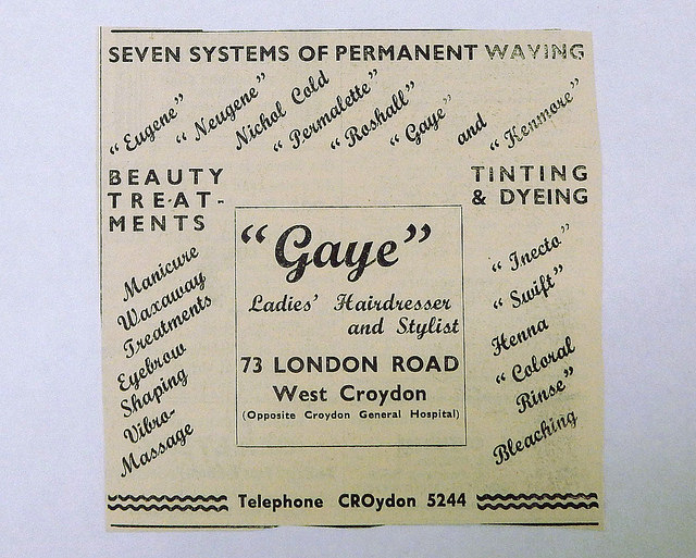 - Gaye, ladies’ hairdresser, is listed at number 73 in Croydon phone books from April 1950 to October 1955 inclusive, and at number 1359 in phone books from the 1953 London edition to the 1977 Croydon edition, inclusive. “Maureen Sybil Short, ‘Gaye’” is listed at number 1359a in Croydon phone books from January 1956 to April 1962 inclusive. Kenneth Short’s name is taken from Kent’s 1955 and 1956 directories, which list Kenneth A Short at number 73 and “Shorts Cellar (prop K Short) — Snack Bar” at number 75.