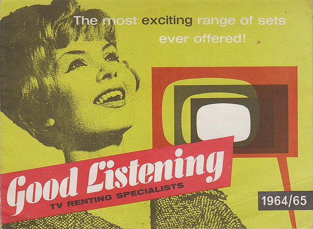 Good Listening later expanded its operations to TV rentals, and by the mid-1960s was advertising “The most exciting range of sets ever offered!” with its “De Luxe” range “completely tuned ready to receive [...] the new BBC 2 programme as well as the existing BBC 1 and ITV 1 transmissions [...and...] equipped to receive any new additional ITV programmes in the future.” The customer was urged to “Be a TWO TV man”, with “No more arguments over which programmes to watch”, as a discount was offered for those renting more than one set.[20]