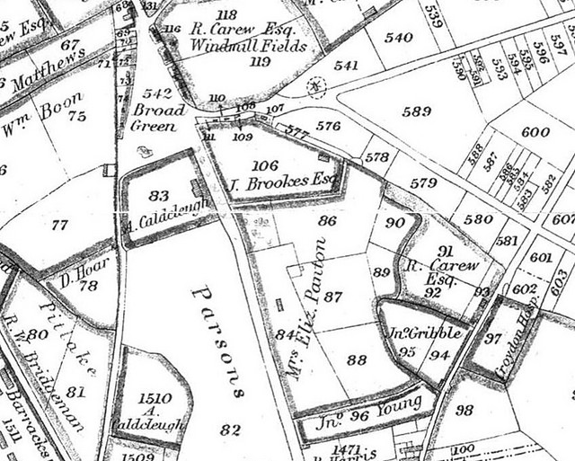 - Information on William’s land purchases is taken from the Conditions of Sale given in particulars for a sale of the estate on 23 June 1865. William acquired “34 perches (or thereabouts) of land” via “an indenture or deed of feoffment on sale by the vicar, churchwardens, overseers of the poor, and six inhabitants of Croydon” on 28 February 1809. He then bought “2 roods and 32 perches (or thereabouts)” from the Croydon Canal Company via “indentures of lease and release dated the 19th and 20th of February, 1813”, and “4a. 0r. 4p. [4 acres, 4 perches] (or thereabouts)” from the trustees of “the late Sir Nicholas Hackett Carew, Bart. [Baronet]” via “indentures of lease and release dated the 6th and 7th of May, 1813”.