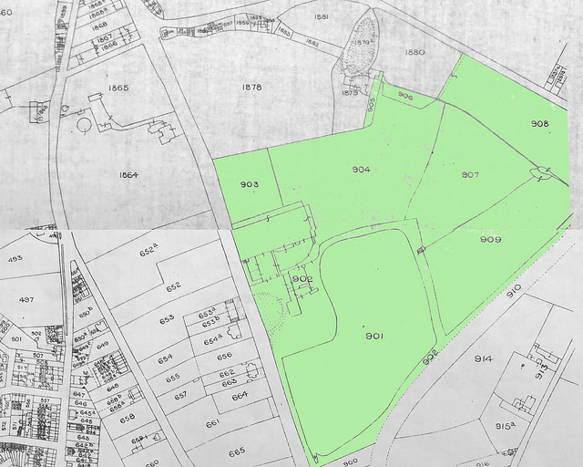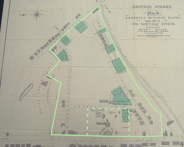 I identified the estate and hospital site boundaries by comparison of maps including the 1844 Tithe Map, the 1896 Town Plans, and the 1954 Ordnance Survey map, as well as the layout of the houses on Oakfield Road today. It appears that the hospital later re-acquired a little of the surrounding land to both north and south, including the plots on the south side marked here as Lots 9 and 10; these latter were the site of Lennard Lodge, which housed Croydon Child and Adolescent Mental Health Services until 2012 but has now been demolished (personal observation; see also my photo of the building in August 2012).