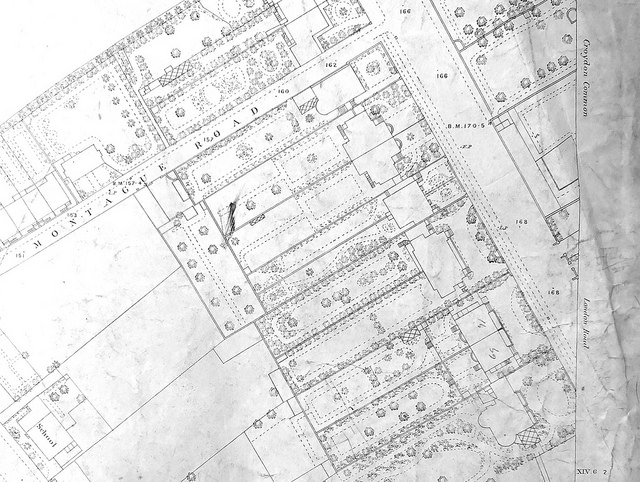 Number of houses and existence of Montague Road in 1851 are taken from Gray’s 1851 Directory of Croydon. Montague Road does not appear on the 1844 Tithe Award map; its later location is simply the boundary between plots 652 (building ground owned by Samuel Bendry Brooks) and 652a (a meadow owned by Henry Overton). Regarding the later addition of two more houses, these appear as “Semi-detached residences, erecting” in Gray and Warren’s 1855 directory, and as being occupied by William Edward Acraman and John Baines in the next (1859) edition. “W E Acraman” and “Baines” also appear in the October 1858 Poor Rate book, so must have been there by then. Unfortunately it isn’t clear from the Poor Rate book who owned the land, as the relevant column has been left blank in both this and later editions; I use the phrase “Samuel’s land” in the article merely to identify its location.