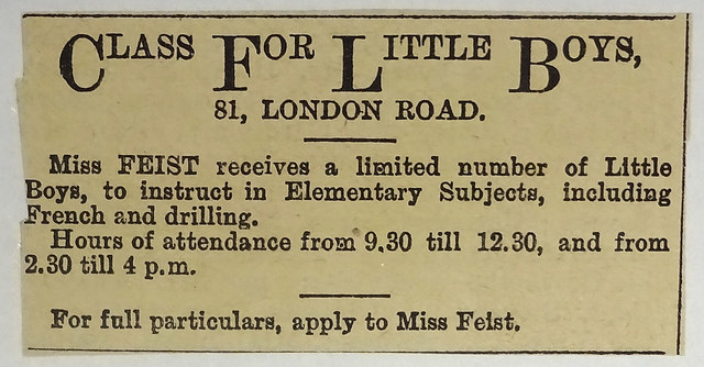 - Information taken from Ward’s directories, with additional information on Miss Feist’s class from an advert in the 14 January 1893 Croydon Guardian, reproduced here.