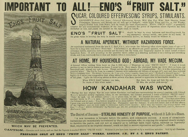 - See the 22 August 1891 Croydon Advertiser advertisement reproduced here. James had the last laugh, however; while William’s name has descended into obscurity, Eno’s fruit salt is still on sale today, manufactured by GlaxoSmithKline as an antacid product under the name “Eno”.