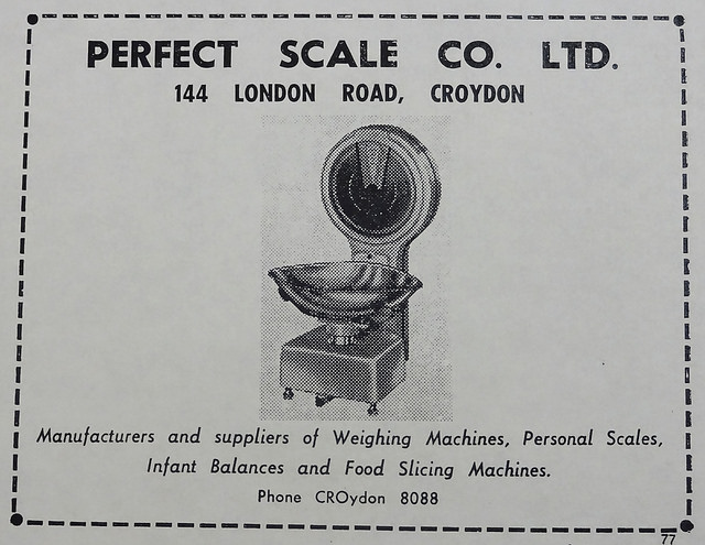 Batchelder Bros and Horace Marshall appear in phone books up to and including the 1939 London edition, and are absent thereafter. The Perfect Scale Co appears (as the “Prefect” [sic] Scale Co) in phone books from the 1948 London edition to the March 1960 Croydon edition inclusive. The advertisement reproduced here suggests that the name in the phone books is a spelling error, though a curiously persistent one, particularly as the company appears to have paid extra for its entry to appear in bold text. Details of products are taken from the abovementioned advert as well as phone books and Kent’s street directories.