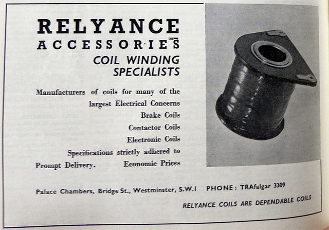 - Relyance Accessories, Coilwinders, is listed in Croydon phone books from 1957 to 1970 inclusive. Surrey phone books give the additional address of Lahore Road, Croydon. Details of items manufactured, along with address of head office, are taken from the 1960 Ryland’s Directory advert reproduced here. Palace Chambers has since been demolished, but according to 1951 Ordnance Survey map sheet TQ3079NW, it was on the north side of Bridge Street, which runs between the northeast corner of Parliament Street and Westminster Bridge. My assertion about access to the premises comes from examination of the 1968 photograph reproduced here, as well as the previously-cited photograph from the John Gent collection. The latter shows a “goods entrance” at the very south of the property, just to the right of the extended shopfront, but this looks too narrow to be a plausible access for an industrial manufacturer.