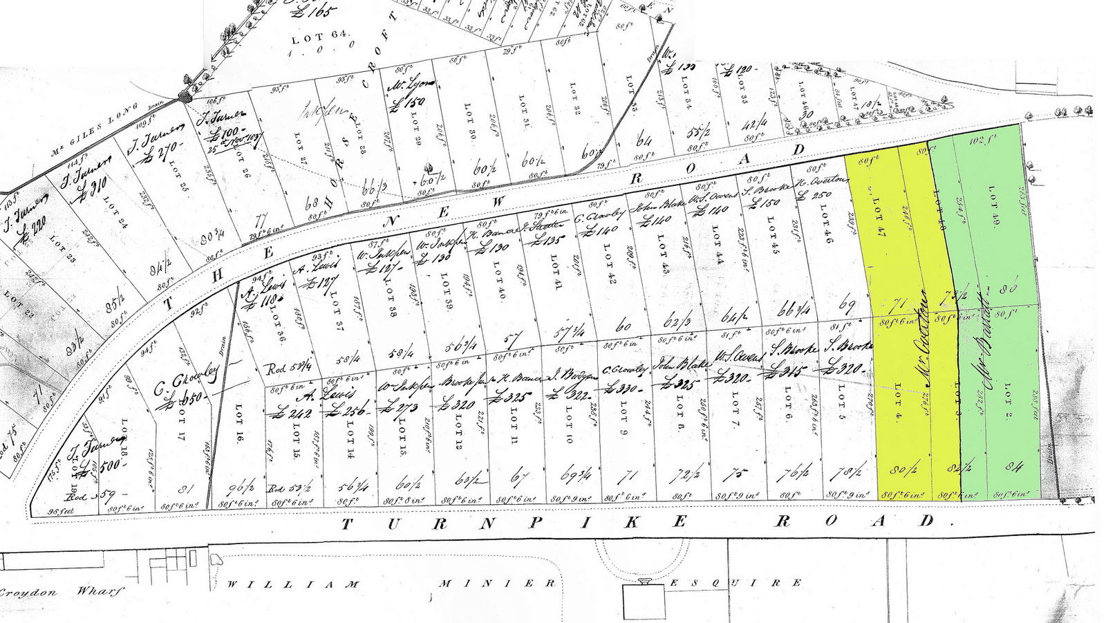 Note also that although the land was offered in six lots (2, 3, 4, 47, 48, and 49) in 1835, it was consolidated into two for the 1838 sale, with lots 3 and 48 being split down the middle. (For proof of this, see the sales plan included in Harold Williams Volume 1837–1840, Section CXVI, at the Museum of Croydon).
