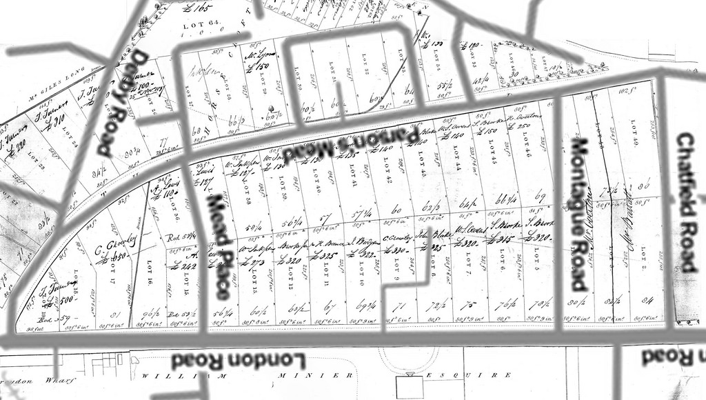 Alexander had lived at Broad Green House, just beyond the north end of Parson’s Mead, and his widow Elizabeth continued to live there after his death. However, after Elizabeth herself died, on 8 February 1835, both Broad Green House and the Parson’s Mead land were auctioned off. The latter was split up into small lots for the auctions, and the plots fronting on London Road ended up being owned by a total of eleven different people.[6]