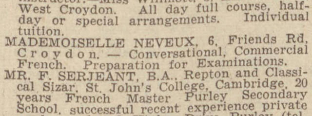 - Neither Miss Earl nor Mlle Neveaux appear in the alphabetical lists of residents or tradespeople in Ward’s directories after leaving London Road, but an advert on page 17 of the 10 March 1939 Croydon Advertiser (reproduced here) places the latter at 6 Friends Road. According to Ward’s directories, during the 1930s, 6 Friends Road was occupied by a succession of women, none of them named Neveaux: Mrs W M Sanders, Mrs E A Sandbach, and finally Miss Prideaux. It seems possible that Mlle Neveaux was lodging with one or all of them.