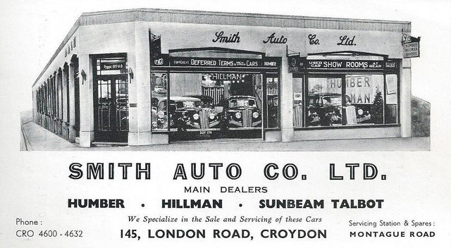 - Smith Auto Co is listed at 145 London Road in Ward’s directories from 1930 to 1939 inclusive (after which no more of these directories were published). It also appears in Kent’s 1955 and 1956 directories, and phone books up to and including the August 1967 Croydon edition. As further evidence, the firms files at the Museum of Croydon include an invoice from Smith Auto Co, 145 London Road, dated 8 October 1963. A planning application submitted on 6 March 1968 (viewed on microfiche at Croydon Council offices; ref 68/20/433/D) states that as of that date the property had been a “Garage and workshop until vacated recently”. Moreover, Dave Harwood notes that a London Metropolitan Archives photo from 1968 has posters in the windows which look like flypostering, again indicating that Smith Auto Co had closed down by that time. Information on the company’s specialisation in Humber, Hillman, and Sunbeam cars is taken from the advert reproduced here. The abovementioned 1963 invoice also includes these names in its heading.