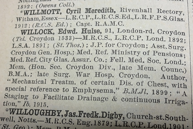 - Ward’s directories list A W Davies, MRCS, LRCP, at 149 London Road (numbered as 91 in 1921–1926) from 1921 to 1939 inclusive; 1939 was the final edition of these directories. He also appears in London phone books (as A W A Davies) up to and including 1940, but I haven’t been able to find him in later editions. These phone books also give the additional address of Verecroft, Sanderstead Road. His full first name is taken from his entry in the 1939 Medical Directory, which also gives his qualification date as 1916. The Medical Directory lists him on Sanderstead Road up to and including the 1941 edition, and at “Address unknown” thereafter.