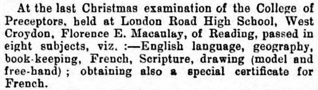- London Road High School For Girls is listed in Ward’s directories from 1876 to 1882 inclusive. All entries include the name of Miss Pearse. Quotation regarding subjects is taken from an announcement on page 5 of the 23 February 1878 Berkshire Chronicle (reproduced here), which states that Florence E Macaulay of Reading had recently passed the College of Preceptors examination in all six subjects and obtained a “special certificate for French”. The 1881 census lists seven “scholar”s at the premises, aged from 9 to 19, as well as two servants, two English teachers, a French teacher, and a music teacher. Miss Pearse is nowhere to be seen; one of the English teachers, 32-year-old Mary Ann Matthews, is listed as the head of the household.