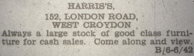 - Ward’s directories were published more sparsely during the 1930s, but the 1932 and 1934 editions list number 152 as unoccupied, while the 1937 edition lists J C Harris, furniture mart, and the 1939 edition instead lists Sportomobiles. Harris’s must have been in place by mid-1936, as it placed an advertisement on page 7 of the 27 May 1936 Croydon Times (from which the quotation in the main text is taken).