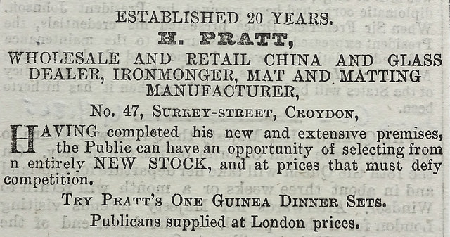 - Henry is listed at 47 (and later also at 47½) Surrey Street in street directories from Gray’s 1851 (the earliest relatively complete directory of this kind) to 1894 inclusive, initially as a “China and Glass dealer” and later as a “China & Glass Dealer, and Furnishing Ironmonger”. (The 1895 edition states that “From No. 42 the houses will be pulled down for the Croydon High Street Improvements”.) The 1871 census lists Henry as a 46-year-old “China & Glass Merchant” living on London Road with his 48-year-old wife Elizabeth, three children (18-year-old Fanny, 12-year-old Grace, and 9-year-old Harry), Elizabeth’s sister Susan, and Susan’s daughter Flora. There’s unfortunately no way to tell whether Susan and Flora were living there or just visiting.
