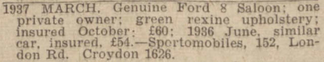 - Sportomobiles is listed at 152 London Road in Ward’s 1939 directory (the final edition published), and also appears here in London phone books for November 1938, May 1939, and August 1939. The May 1938 edition lists it instead at 1 Bensham Lane. I don’t have access to a 1940 London phone book for names beginning L–Z, but I have checked later editions, in which Sportomobiles does not appear. Information on its trade in second-hand cars is taken from an advert on page 17 of the 6 January 1939 Croydon Advertiser (reproduced here).