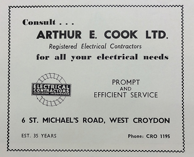 - Ward’s directories list Arthur E Cook, electrician, at 7 Greenside Road from 1921 to 1928 inclusive; Arthur E Cook Ltd, electrical contractors, at 17A Station Road from 1929 to 1932 inclusive; and A Cook Ltd, electrical contractors, at 152 London Road in 1934, 1937, and 1939 (the final three editions of these directories). A photocopied advert from the July 1949 Croydon Manufacturing & Industrial Exhibition catalogue (found in the firms files at the Museum of Croydon) lists Arthur E Cook Ltd, 6 St Michael’s Road, as one of Croydon’s National Registered Electrical Installation Engineers and a member of “Croydon Electric Circle”. Two advert clippings, also found in the firms files, state that Arthur E Cook Ltd has been established for 35 years and 37 years respectively; the handwritten dates on these clippings are 1954 and 1959, which doesn’t quite match up, but suggests the firm was founded around 1920. Arthur E Cook does not appear in Ward’s 1919 directory, which fits well with this.