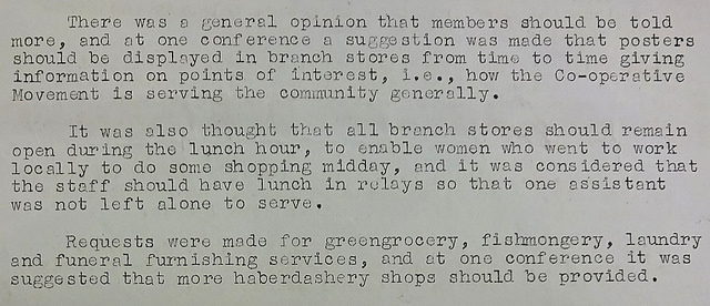 The SSCS was thus relatively late in beginning to provide funeral services. It isn’t clear what prompted it to finally get around to this, though requests from members may have been part of the reason; one example comes from a series of “Food Conferences” held by the SCCS in October and November 1941, attended by both officers and members of the Society. A brief report on these conferences notes that “It was evident that on the whole the members were fairly satisfied with the service given by the Society, and felt they had no real cause for complaint after two years of war” but that “Requests were made for greengrocery, fishmongery, laundry and funeral furnishing services”.[10]