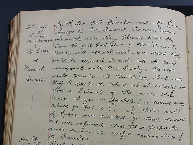 In doing this, it was following the example of other co-operative societies, such as the Royal Arsenal Co-operative Society (RACS), which had introduced funeral furnishing in 1929. Indeed, according to Gillian Lonergan at the National Co-operative Archive, “co-operative societies were involved in funerals at the end of the nineteenth century, though funerals at that time were normally carried out by the family and the major need was for a coffin and a means of transporting it to the cemetery. Societies’ works departments often organised the making of a coffin and loan of a wagon.”[9]