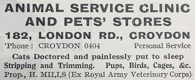 - Harry Mills, Animal Clinic, is listed in London phone books for May 1936, November 1936, and May 1937. Ward’s 1937 directory also lists him, as H Mills. Ward’s 1939 directory lists Dairy Farm Produce, but gives no further details, and this was the last ever edition of these directories. I haven’t been able to find Dairy Farm Produce in contemporary phone books, and there’s nothing in the firms files at the Museum of Croydon.
