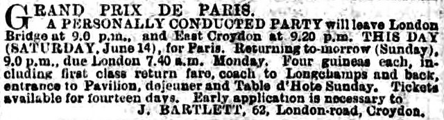 Jane also had a sideline in organising trips to France, including a “Personally-conducted Excursion” to the 1900 Paris Exhibition and “popular week-end excursions for Sporting and Business Men”. Her trip to the 1902 Grand Prix de Paris horse race cost four guineas per person (£491 in 2017 prices), and included “first class return fare” for the overnight journey to Paris on the Saturday evening, a “coach to Longchamps and back” on the Sunday of the race, “entrance to Pavilion”, and “dejeuner and Table d’Hote” before an overnight return to London arriving at 7:40am on the Monday.[7]
