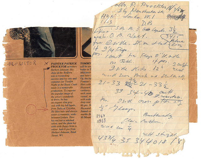 Napoleon seems to have catered for the fashionable side of the market, judging by the appearance of one of his suits in an April 1968 Daily Telegraph men’s fashion feature: “an elegant slim grey suit with big full lapels” worn by artist Patrick Procktor.[13]