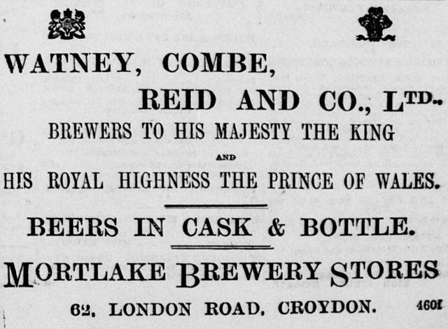 - According to an article on page 2 of the 19 February 1898 Croydon Advertiser (“A Croydon beerhouse”), as of 1898 Watney’s held a lease with 23 years left on it. Information and quotation on the merger with Combe and Reid is taken from The Story of Watneys by Walter Pearce Sercold (Watney Combe Reid & Co Ltd, 1949, pp.13–20, 25).