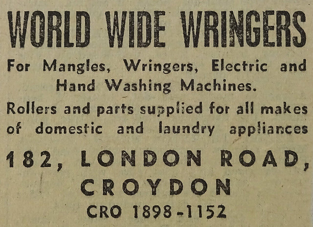 Phone books list World Wide Wringers at 182 London Road up to and including the 1963 Croydon edition. Later editions list it only at 1b Kidderminster Road, where it remains until the February 1981 Croydon edition and then vanishes entirely.