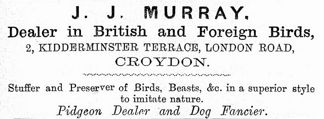 - Ward’s directories list J J Murray, bird fancier, from 1876 to 1891 (as J J Murray, “sen.” [senior] from 1886 onwards). Kelly’s 1889 and 1890 directories list John Joseph Murray, sen., “naturalist &c”. He also appears here in the 1881 and 1891 censuses (as John Murray, “Naturalist”, and John J Murray, “Naturalist, Bird”, respectively). Quotation re stuffed birds is taken from an advert in Wilkins’ 1876–7 directory (reproduced here), and quotation re parrot is taken from an advert on page 4 of the 3 November 1888 Croydon Guardian.