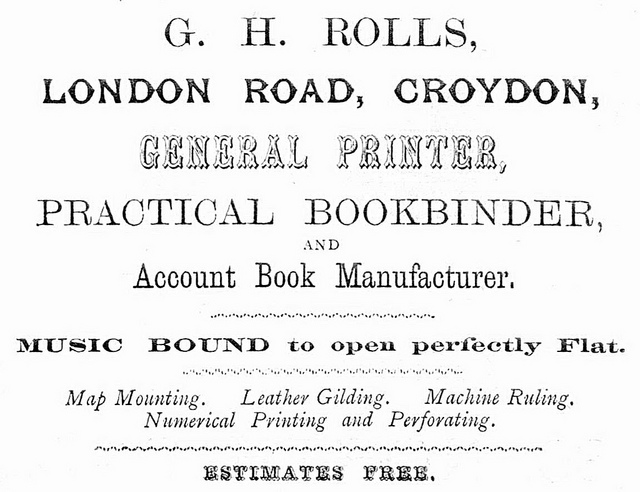 - 4 Kidderminster Terrace does not appear explicitly in Wilkins’ 1872–73 directory, suggesting that the premises were vacant. Ward’s directories list G H Rolls, bookbinder, in 1874 and 1876; G H Rolls, bookbinder and printer, in 1878; and W C H Ford, bookbinder and printer, in 1880. An advert on page 4 of the 22 November 1879 Croydon Chronicle offers a house and shop to let, with application to be made to “G. H. Rolls, Kidderminster-terrace, London-road, Croydon”, suggesting that Mr Rolls remained on London Road until around that time. Quotation re musical scores is taken from an advert in Atwood’s 1878 directory, reproduced here.