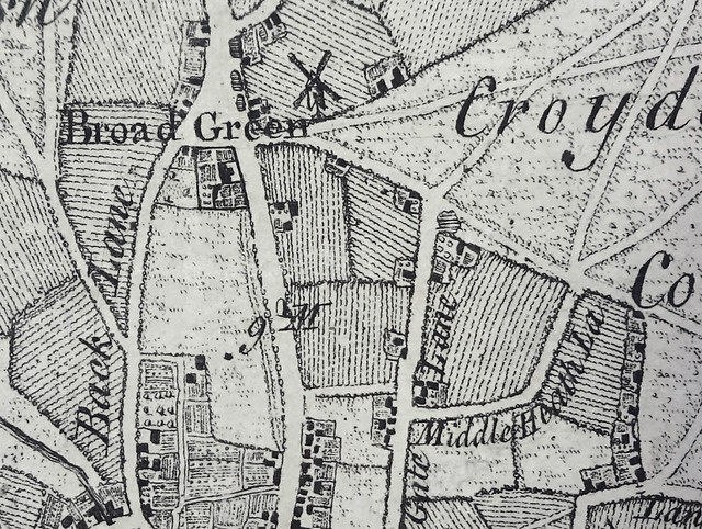 I worked out the boundaries in terms of modern roads by comparing Roque’s 1768 map to the 1800 Inclosure map, which as can be seen in part 1 of my mini-series on Zodiac Court lines up quite nicely with the modern road layout. My attempts at a similar superposition of Rocque’s map over the Inclosure map and of the modern road layout over Rocque’s map were much less satisfyingly neat. However, the Broad Green triangle and the routes of London Road, St James’s Road, Sydenham Road (“Middle Heath La[ne]”) and Wellesley Road (“New Gate Lane”) are clearly shown on Rocque’s map. The line of Wellesley Road is much straighter on Rocque’s map than on the Inclosure map; I suspect this to be an error of surveying rather than an actual change.