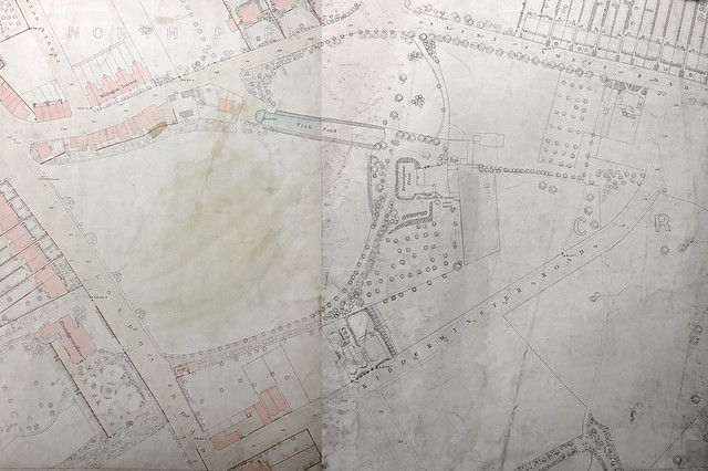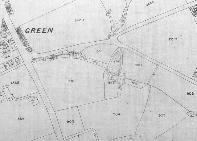 The boundary between James’ plots 1879/1879a/1880 and Richard’s plots 905/906 is not entirely obvious, as this map does not clearly distinguish between lines indicating plot boundaries and lines indicating fences and buildings. However, 905 and 906 are listed in the award as “Garden” and “Garden and orchard”, respectively, with no mention of buildings, while 1879 and 1879a are “house / out offices / yard / gdn [garden] & pt [part] of lawn” and “carriage drive / outbuildings & pt of lawn” respectively, which I believe implies the division I show in the highlighted excerpt included here.