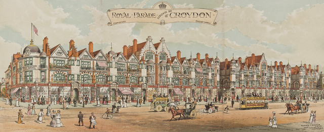 On 18 July 1901, Mr A H Batley deposited plans with the County Borough of Croydon for “26 Houses & Shops” to be known as Royal Parade.[23] The architect in charge was Horace Thomas Bonner of Lewisham.[24] Stretching along the London Road frontage of the Broad Green Place estate from its southern edge to the junction with St James’s Road, the parade was designed with “a riot of architectural detail topped by numerous gables and domes”.